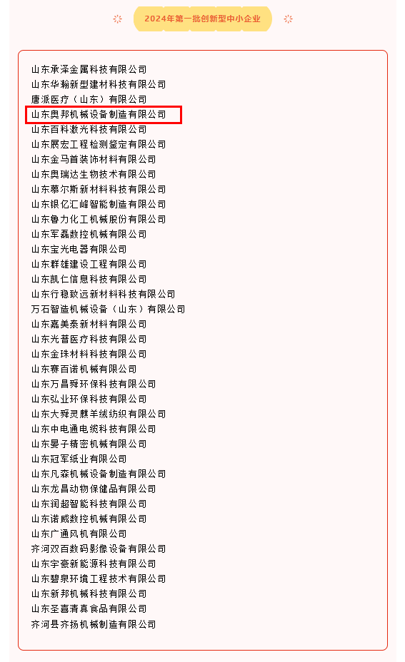 近日,山东省工信厅公布山东省2024年度第一批创新型中小企业名单,山东奥邦机械设备制造有限公司成功上榜!